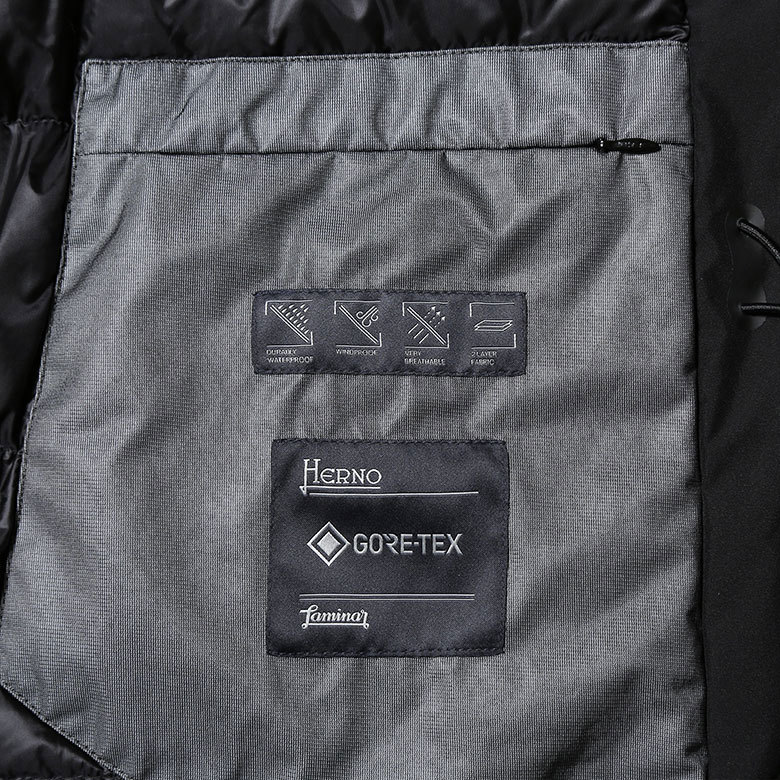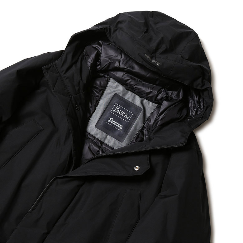 LAMINARシリーズのダウントレンチコートは二重構造のゴアテックスを使用しているため、防風・透湿・防水耐久性に優れた一着です。トレンチコートにダウン素材を使用することは珍しく、ヘルノならではのデザインと言えます。着脱可能のフードと少し長めの丈感で今っぽさもありながらスマートな着こなしをサポートしてくれるでしょう。