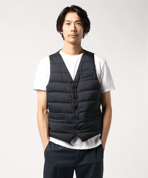 ヌアージュナイロンを使用したLEGENDシリーズのジレは、テーラード仕立ての美しいシルエットが特徴のベストタイプです。通常のダウンベストはスポーティなデザインが多い傾向ですが、こちらはビジネススーツと合わせても違和感のない着こなしができます。背面にはダウンを入れていないため、着膨れを抑えられる点も魅力です。