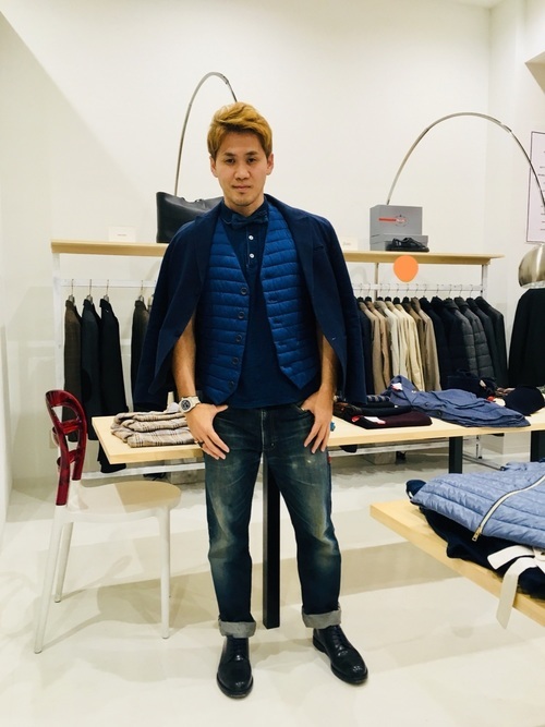 スーツジャケットの上に着用する場合やインナーに厚手のニットを着用する場合には、ゆとりを持ってワンサイズ大きめのもの、インナーとして着用する場合はジャストサイズがおすすめ。ヘルノのダウンはダウンパックを省いた設計のため、冬のレイヤードコーデでも着膨れすることなくすっきりとした着こなしが可能です。
