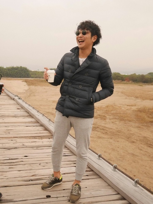 ヘルノのピーコートダウンを使用したコーデです。スウェットパンツとスニーカーのラフなコーデでも、ヘルノのダウンを合わせるとスポーティカジュアルなメンズコーデになります。