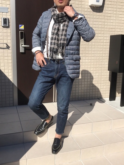 ヘルノのシングルジャケット型ダウンを着用したコーデです。スリムシルエットのジーンズにローファーを合わせ、キレイめカジュアルな大人の着こなしになっています。さりげないサスペンダーがおしゃれです!