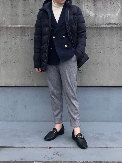 ヘルノのダウンジャケットとダブルテーラードジャケットを合わせたコーデです。インナーの白のタートルネックやローファーでトラッドな雰囲気のある着こなしに。足首を出すことで抜け感を演出し、着込むことが多い冬でもバランスを取ることができます。