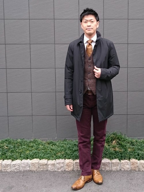ヘルノラミナーシリーズのステンカラーダウンコートを使用したコーデです。赤、茶、黄色系のアイテムに黒のダウンコートをアウターに着用することで、全体が締まった印象になります。フォーマルな場面にも最適な着こなしです。