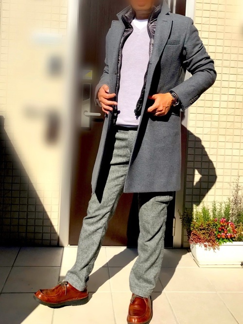 ヘルノのメルトンチェスターコートを使用したコーデです。細身のシルエットが美しく、ビブスを開けて着用しても違和感がありません。コートとビブスが同じ色味で目立ちにくいので、ダウンに抵抗がある人でもハードルが低いのではないでしょうか。