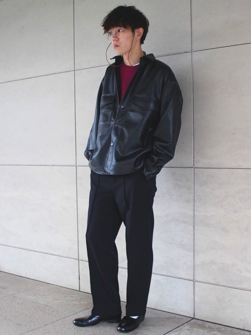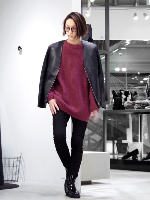 シンセティックレザーときれいめパンツのクールなブラックコーデにピンクニットが効いています。こんなベリー系のピンクなら、コーデのシックな印象を崩さず、知的でおしゃれな印象をプラスできますね。