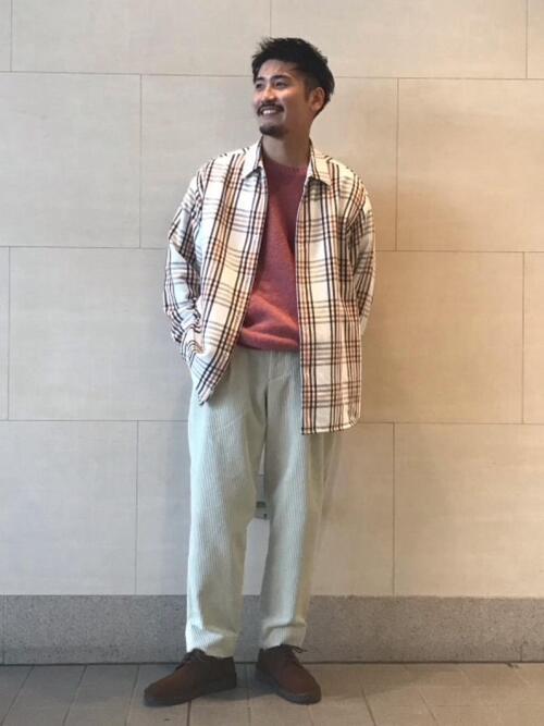 温かみのあるコーラルピンクのニットを白のコーデュロイパンツとオレンジ系のチェックシャツでカジュアルに着こなしたメンズコーデ。白の分量が多いスタイリングの中で、差し色のピンクが効いています。ブラウンのシューズで落ち着いた印象に。