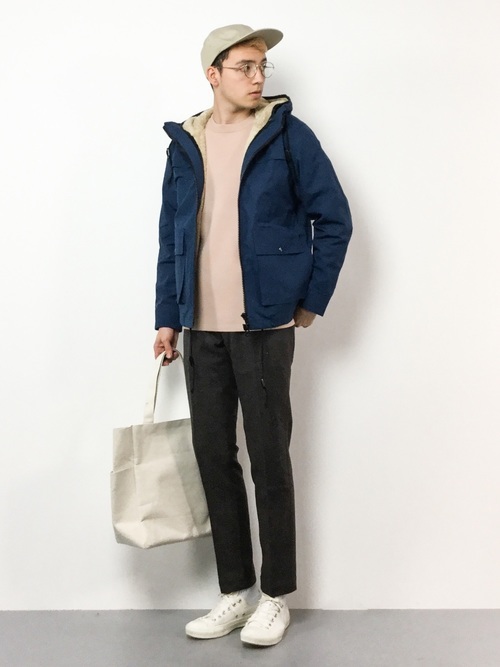 ピンクとモノトーンのクリーンな色合わせが新鮮なカジュアルメンズコーデ。淡いピンクのセーターが品のよさをプラスし、都会的な印象のアウトドアスタイルになっています。