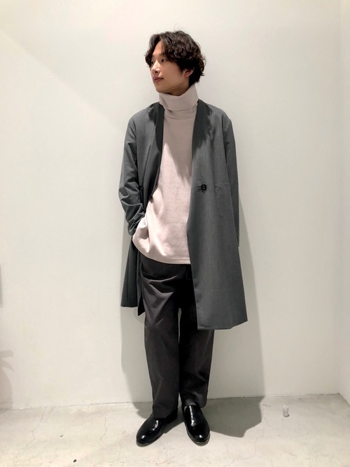 ピンクのタートルニットを使用したミニマルなメンズコーデ。ゆったりしたシルエットのライトピンクのタートルニットは、一枚でもこなれた雰囲気にきまるので初心者にもおすすめのアイテムです。ノーカラーコートを合わせてモードな着こなしに仕上がっています。
