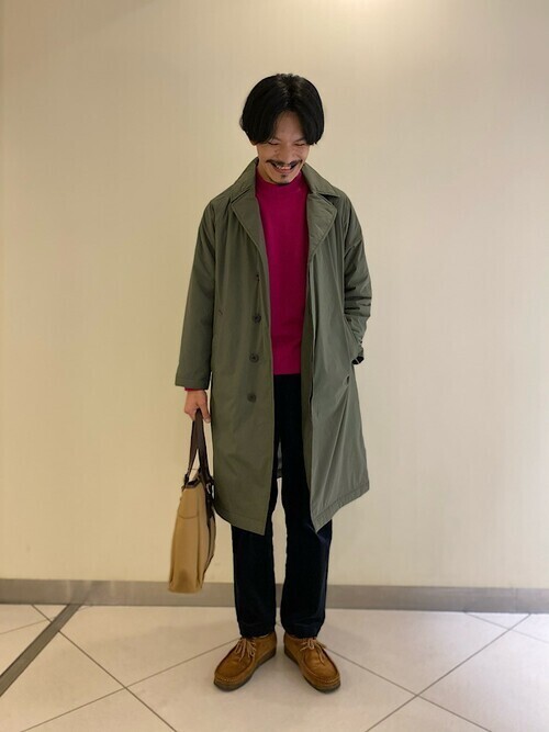 こちらも上記と同じピンクニットを使用したメンズコーデです。オリーブグリーンの中綿バルカラーコートとネイビーのコーデュロイパンツを合わせて、スッキリしたシルエットの上品な着こなしに仕上がっています。