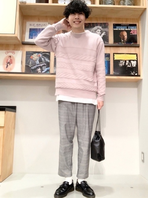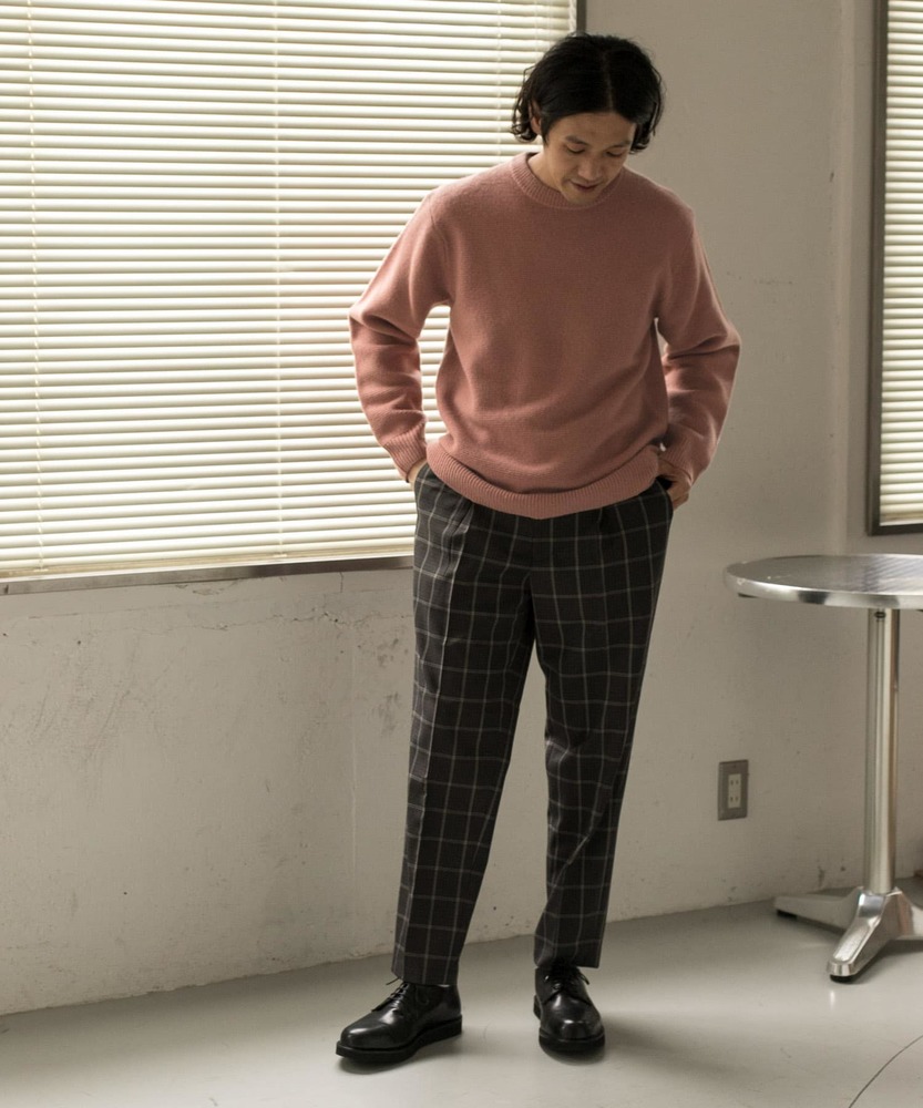 ライトなくすみピンクニットとグレンチェックパンツの上品な組み合わせに、白のインナーとソックスがさわやかさをプラス。シューズとバッグの黒で引き締まり、メリハリのある着こなしになっています。適度なゆとりのあるシルエットが今の空気も感じさせますね。