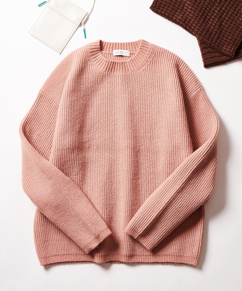 肌馴染みがよく、スタイリングにも取り入れやすいサーモンピンクのシンプルな畦編みセーター。トレンド感のあるゆったりシルエットで着回し力もバツグンです。毛羽立ちが少なく、チクチク感もないので、デイリーユースにおすすめの一着。