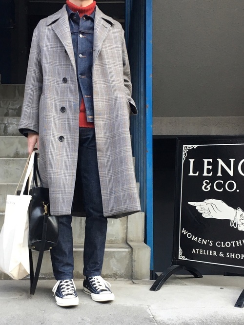 デニムジャケットに、チェックコートを羽織った冬コーデです。ジャケットをインナーとして使い、コーデのアクセントにしています。中に赤のニットを着用することで、ジャケットを引き立てて地味見えしない着こなしに。足下はスニーカーでカジュアルさを後押ししています。
