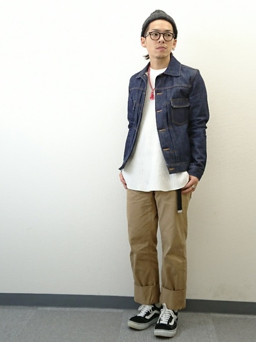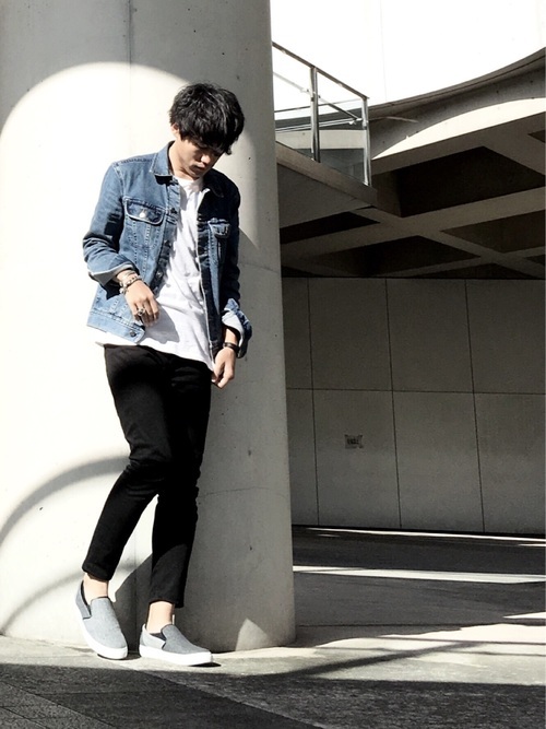 白Tシャツとデニムジャケットを合わせたラフなコーデです。上半身がラフな組み合わせなので、パンツはチノパンできちっと感をプラスし程よいリラックス感を残した着こなしです。足下に黒のスニーカーで引き締めることも忘れていません。