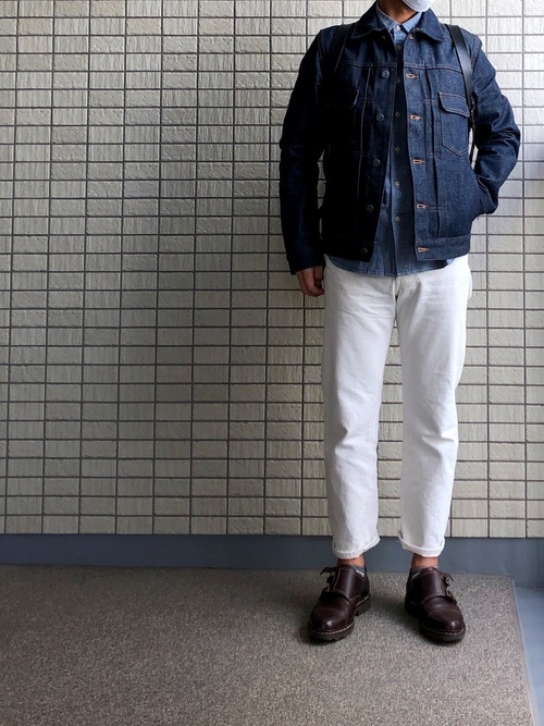 白パンツにデニムジャケットを羽織った爽やかなコーデです。パンツとジャケットコントラストですっきりとした印象の着こなしに。ジャケットの中に同色系の淡いシャツを着て統一感を出し、革靴できちっと感を演出しています。シルエットがきれいで、組み合わせ方がとても参考になりますね。