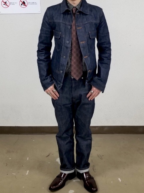 濃いデニムジャケットと、濃いデニムパンツのコーデです。デニム×デニムはアメカジやストリートになりがちですが、ネクタイやシャツ、革靴を取り入れることですっきりとしきちっと感のある着こなしに。足下をロールアップしてこなれ感を演出した一味違うメンズコーデです。