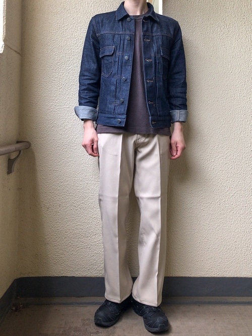 ハリ感のあるチノパンにデニムジャケットを羽織ったキレカジコーデ。Iラインシルエットのコーデにセンタープレスのパンツを取り入れることでよりすっきりとし、程よいカジュアル感があります。それぞれのアイテムがシンプルだからこそ、ジャケットの良さがとても活きた着こなしです。