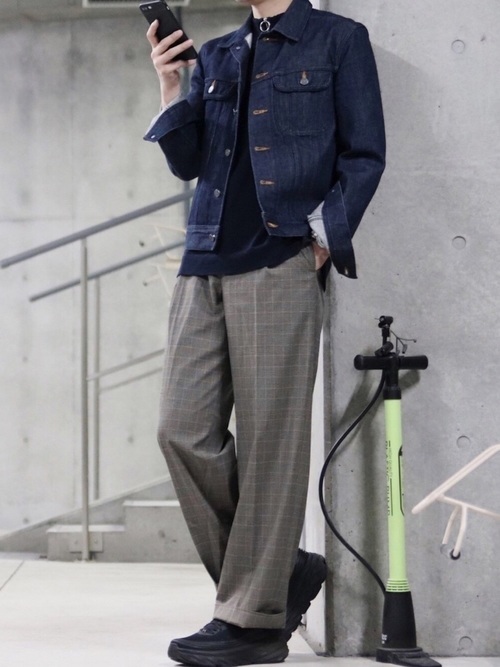 チェックパンツにデニムジャケットを合わせた秋らしさのあるコーデです。インナーを黒にすることで野暮ったい印象を感じず、スマートな雰囲気を醸しています。全体的に暗めの色でまとめ、デニムジャケットをアクセントとして取り入れたおしゃれな着こなしです。