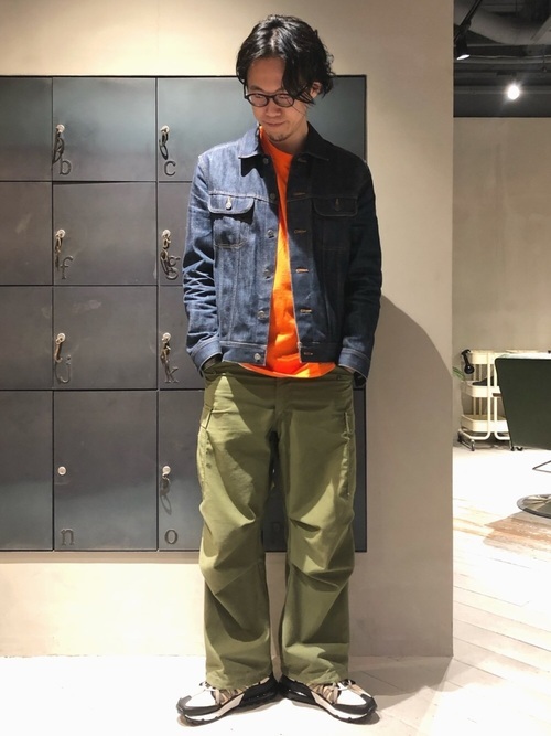 緑のカーゴパンツと派手色シャツに、デニムジャケットを合わせた個性派コーデです。パンツとジャケットの色が落ち着いたものにすることで、まとまりのある着こなしに。スニーカーも本来は派手なアイテムですが、パンツをロールアップせずに履くことで程よく隠れ主張しすぎず馴染んでいます。