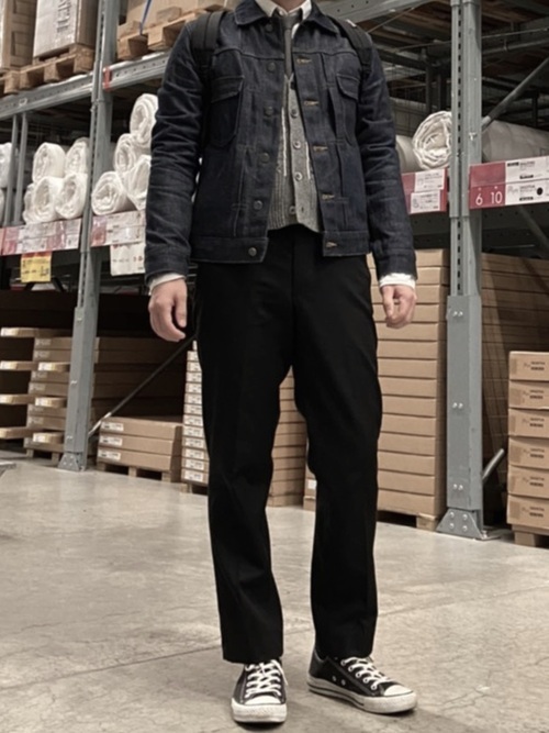 黒スラックスにデニムジャケットを羽織ってカジュアルダウンさせたコーデです。ジャケットとスニーカーはカジュアルに、シャツやネクタイのきっちと感をあわせてバランスが絶妙な着こなしに。暗い色味でクラシカルさを感じ、洒落っ気漂うコーデとなっています。