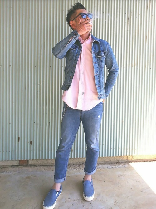 淡いデニムジャケットに、淡いカラーシャツと淡いデニムパンツを合わせたコーデです。インナーをシャツにすることできちっと感をプラスし、淡いジャケットの野暮ったいという印象を払拭しています。デニム×デニムだからこそ、色落ちのかっこよさがとても活きた着こなしです。