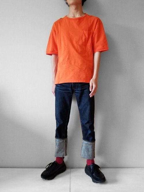 見た目にとてもシンプルな、カジュアルメンズコーデになります。ビビッドなオレンジのTシャツが、ジーンズの濃紺と対照的でとても映える着こなし方です。履く・洗うを繰り返していくうちに、色落ち具合がよりカッコよくなってきます。やっぱり、高級感のあるセルビッチデニムなだけに、裾上げせずロールアップして履くメンズコーデが目立ちます。