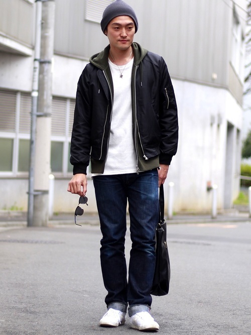 モノトーンなMA-1にパーカーを重ね着して、インナーとスニーカーの白がいい差し色になったメンズコーデになります。履いているジーンズの色落ち具合や小物の使い方に、すごく個性が感じられます。シンプルな組み合わせですが、清潔感のあるメンズコーデだと言えます。