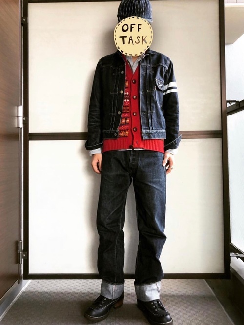 上下ともに桃太郎ジーンズ製のアイテムでまとめて、とてもカッコよく仕上がったメンズコーデです。ジーンズだけじゃなく、ジャケットの色落ちも楽しみたいところではないでしょうか。インナーに着ている古着のニットベストが、アメカジコーデらしい雰囲気をかもちだしているのが見て取れます。