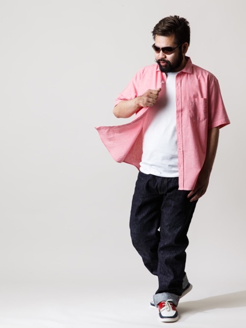 桃太郎ジーンズの濃紺に、トップスで着ているピンクのシャツが良く映えたメンズコーデになります。インナーの白Tも、見た目に清潔感があります。足元をデッキシューズからスニーカーに変えると、カジュアル感が増したメンズコーデに仕上がるので、ぜひ試してみてください。