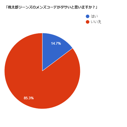 アンケートの結果によりますと85.3%の人が「桃太郎ジーンズはダサくない」と回答しています。実際に桃太郎ジーンズをカジュアルからフォーマルまで、おしゃれに履きこなしている方はたくさんいます。結論から言いますと着こなし方を間違えない限り、桃太郎ジーンズはおしゃれに見せられるということです。
