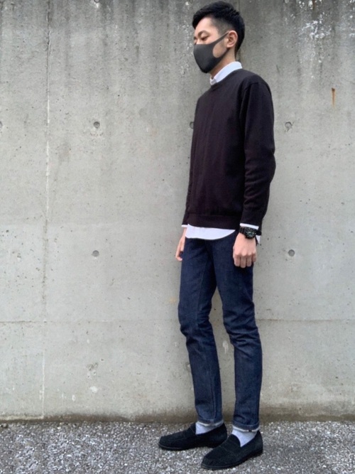 クルーネックニットにボタンダウンシャツ、そこにA.P.C.のジーンズをあわせたシンプルなコーディネートです。シンプルなニットとシャツ、ストレートジーンズという、アイテムはそれぞれシンプルですが、とてもおしゃれな着こなしとなっています。