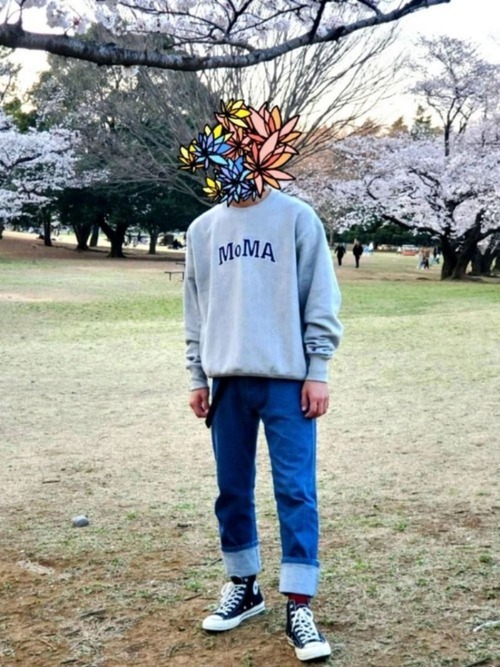 こちらは、ダボっと大きめのスウェットプルオーバーと、A.P.C.のストレートジーンズを合わせた着こなしです。レギュラーなストレートジーンズがきれいめのシルエットなので、緩めのシルエットのプルオーバーがいいバランスを生み出しています。
