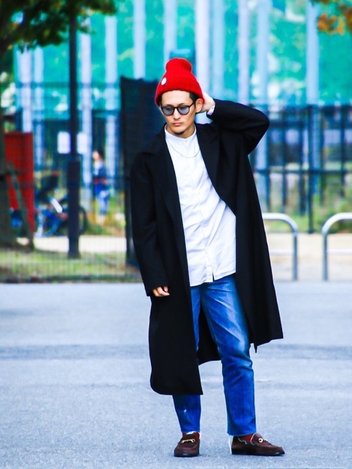 黒のロングジャケットが印象的なこちらのコーディネートは、ジーンズのストレートのシルエットが非常に映える着こなしとなっています。差し色となっている赤のニット帽もおしゃれですね。