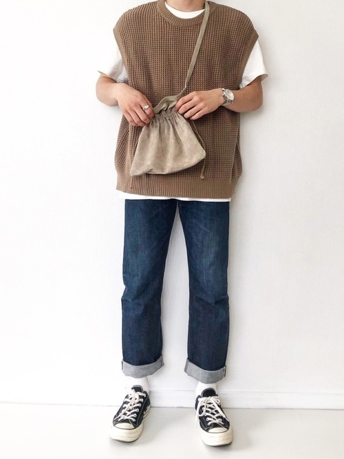 こちらは、ニットベストがアクセントになったカジュアルなコーディネートです。ユニクロのクルーネックTにニットベスト、A.P.C.のデニムを合わせています。ニットベストがカジュアルな印象をあたえるので、スリムできれいなシルエットのジーンズと相性がいいですね。