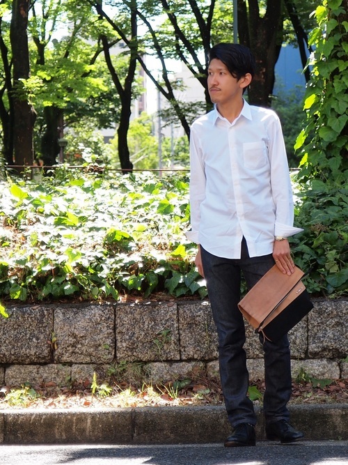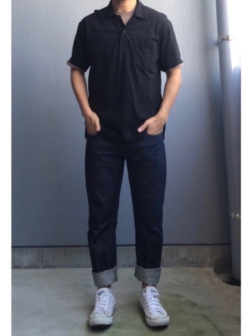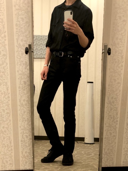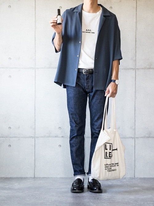 こちらは、黒の開襟シャツに、A.P.C.のジーンズを合わせたシンプルでクールなコーディネート。全体的にスリムなシルエットで、非常にきれいな着こなしですね。いろんなシーンで好印象間違いなしの着こなしです。
