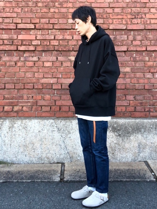 こちらは、黒のオーバーパーカーにA.P.C.のストレートジーンズを合わせたコーディネート。スリムなシルエットのストレートジーンズには、こういったオーバーサイズのトップスを合わせると、それだけでとってもオシャレな印象の着こなしになりますね。