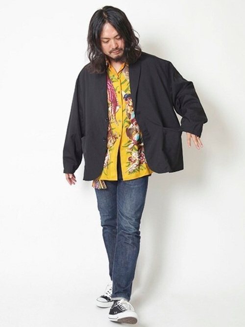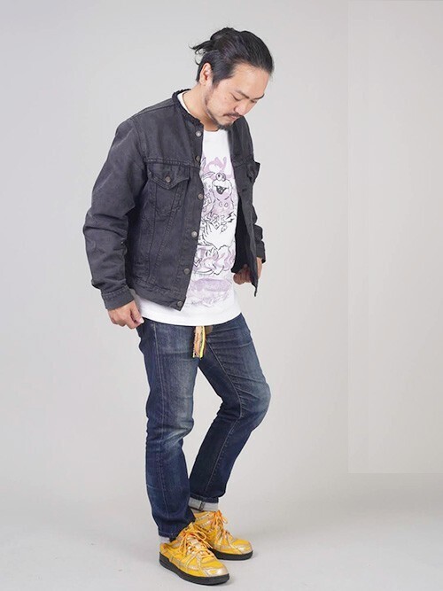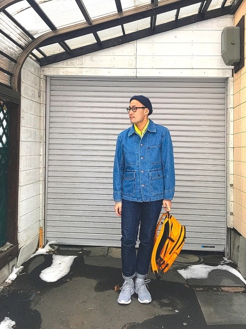 こちらは、ユニクロのデニムワークジャケットと合わせたコーディネートになります。デニムオンデニムで、カジュアルな印象となっています。刺し色の黄色のシャツもとてもおしゃれです。
