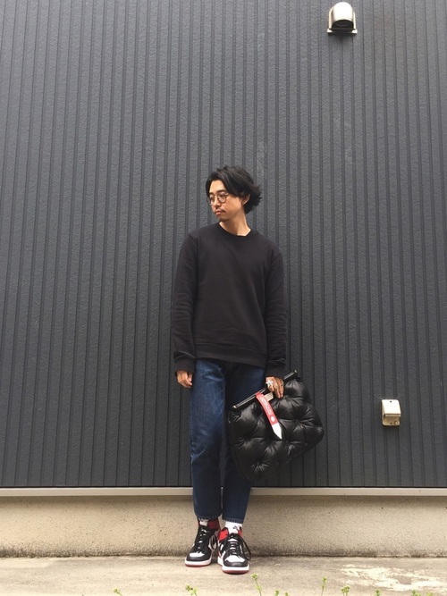 こちらは、シンプルな黒のスウェットシャツにプチスタンダードを合わせたコーディネートです。プチスタンダードのようにシルエットがきれいなレギュラージーンズなら、このようなシンプルなコーディネートもオシャレに着こなせます。