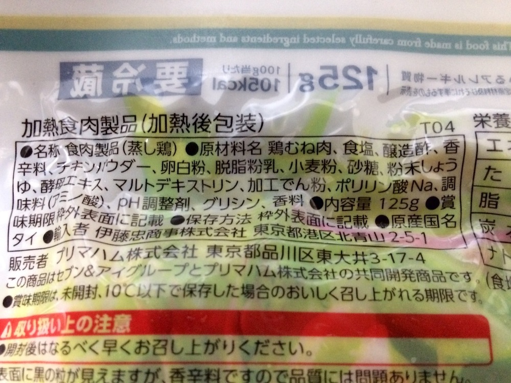 原材料表示には、食品原料に続き添加物が書かれています。こちらのサラダチキンの場合の添加物は