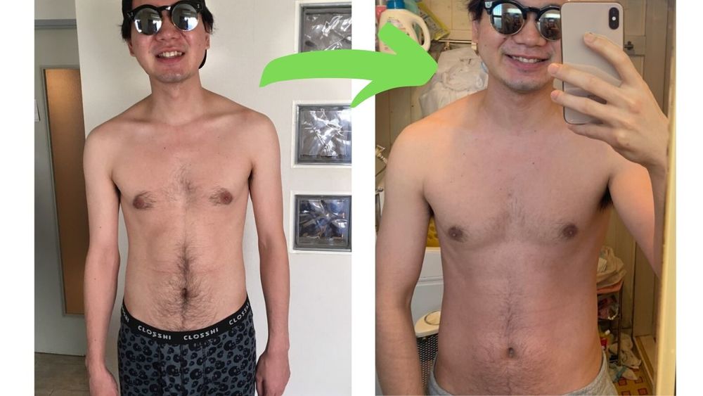 もともと痩せ型ですが、筋トレによって筋肉がつき、たくましい体形になりました。腹筋も割れ、腕の筋肉がしっかりとついたのが印象的です。