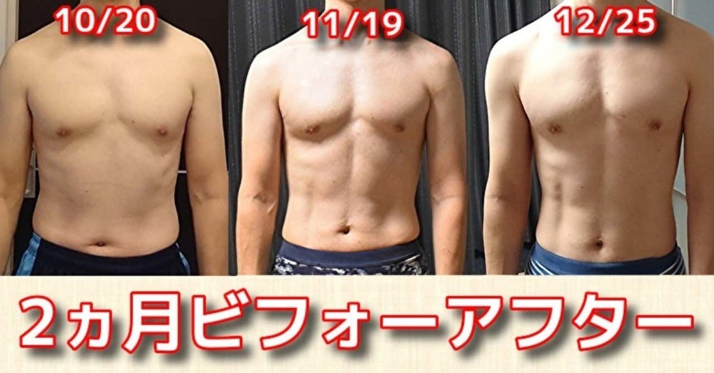 2ヶ月後には明らかに見た目が変化した例です。かなり脂肪が蓄積した状態のビフォーの画像ですが、脂肪も落ち腹筋もしっかりと割れています。