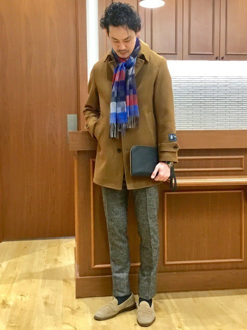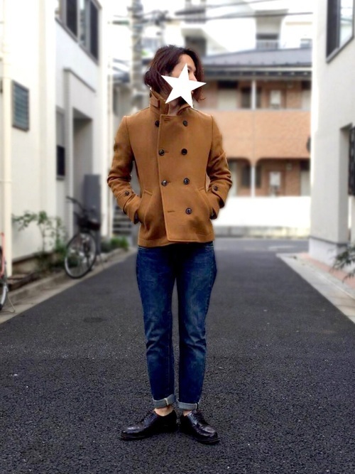 ベージュのPコートは上品なのでビジネスや少しフォーマルなコーデにも良く似合います。こちらはボトムスにデニムを合わせてカジュアルに。ソックスがあえて見えないものを選び足下に抜け感を作り出しています。