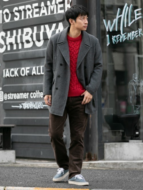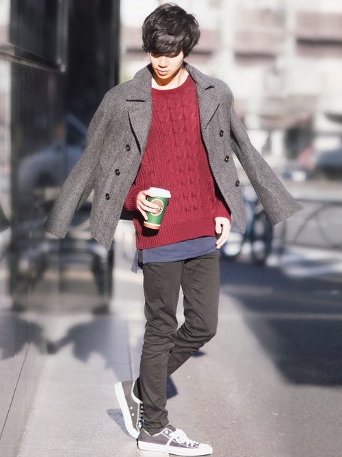 微妙なニュアンスカラーが美しいグレーのPコートを着用したメンズコーデです。ケーブルニットが冬感を増幅。足下は軽やかにスニーカーを着用して街中でも浮かずおしゃれに見える着こなしです。