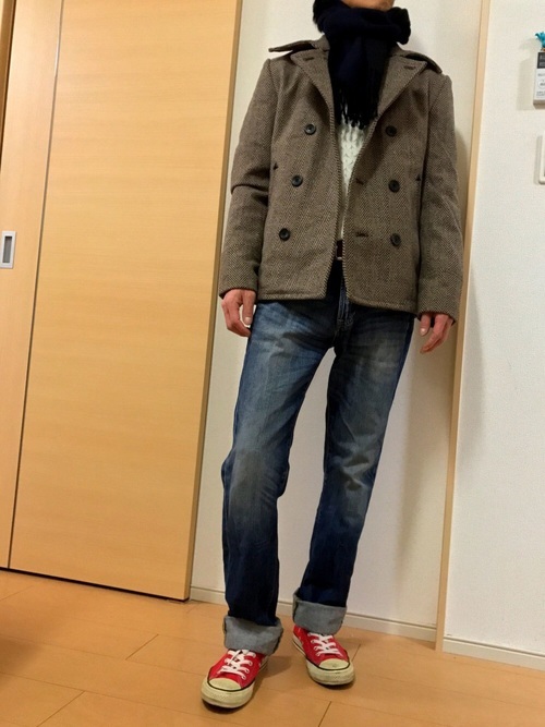 一言でPコートと言っても着丈は様々です。こちらは少しロング丈の物を着用したメンズコーデ。ボトムスはデニムでカジュアルアイテムですが、Pコートの着丈が長めなのでエレガント寄りの印象に。ソックスの白とトップスがマッチしていておしゃれな印象を受けます。