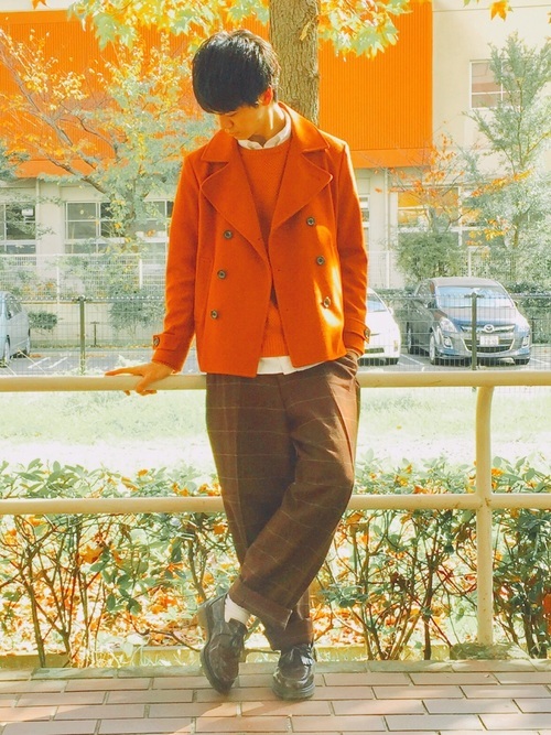 オレンジのPコートは秋にぴったりのアイテム。こちらのメンズコーデではチェックの太めパンツと合わせてかわいらしい印象に。襟元から覗くシャツとソックスの白がコーデにリズムを作り出しています。