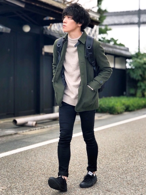 カーキのPコートを白と黒でまとめたメンズコーデです。おしゃれに見えるのに真似しやすく街中でも浮かない着こなしは秀逸。スニーカーも黒でまとめてすっきり見せるのがポイントです。