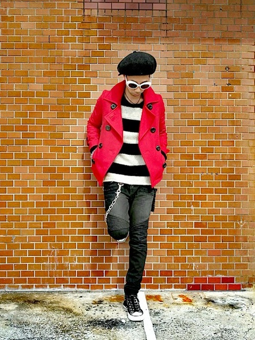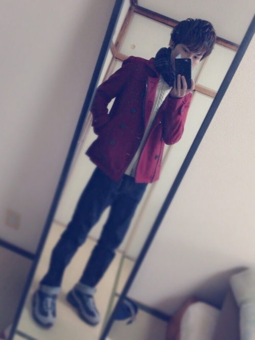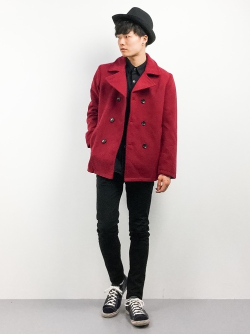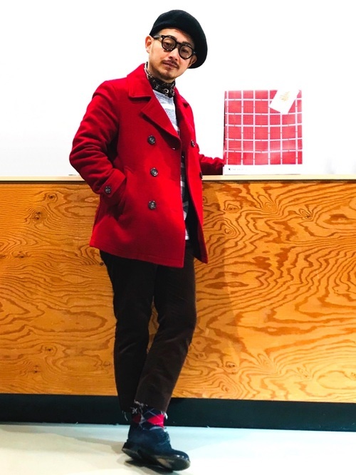 大人の男性がレッドのPコートを着用すればちょい悪オヤジ風に整えることもできます。こちらは襟元にスカーフ、メガネにキャスケットと小物使いがおしゃれなメンズコーデです。