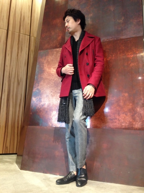 ショールを使った大人っぽいメンズコーデです。ボトムスはスラックス、足下は革靴で大人っぽくキメればレッドのPコートも大人見えします。