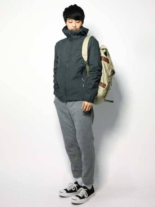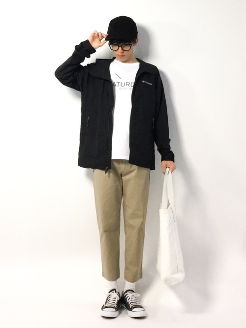 無地のベーシックカラーのマウンテンパーカーにきれいめのパンツやクリーンな印象のインナーを合わせれば、アウトドア感を感じさせないきれいめカジュアルスタイルになります。定番のバックパックではなく、トートバックを合わせるのもポイント。