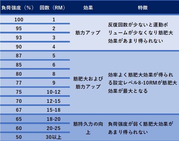 また、RMは負荷の程度とその負荷に対する回数によって、期待できる効果がかわってきます。負荷重量と最高反復回数による効果についてはRMの表で確認が可能です。表についてはRM法の使い方で紹介します。