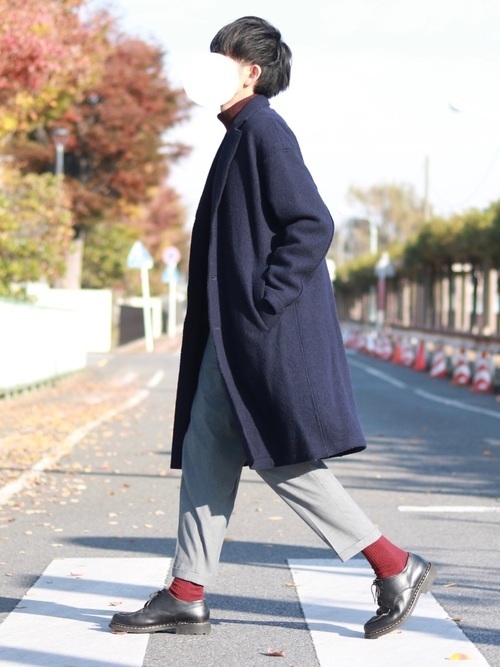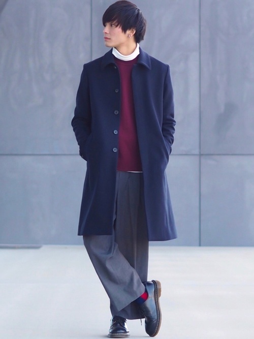 こちらのコーデはグレーパンツとネイビーのロングコートを着こなし、知的な印象に仕上げています。しかし足元の靴下や、タートルネック部分に差し色の赤を持ってきて、彩のある冬コーデに仕上げているのです。暗めの色物をチョイスしがちな冬コーデですが、あえてぱっと目の引く色物を持ってくると、おしゃれなコーデに仕上げやすいのでぜひ試してみてください。